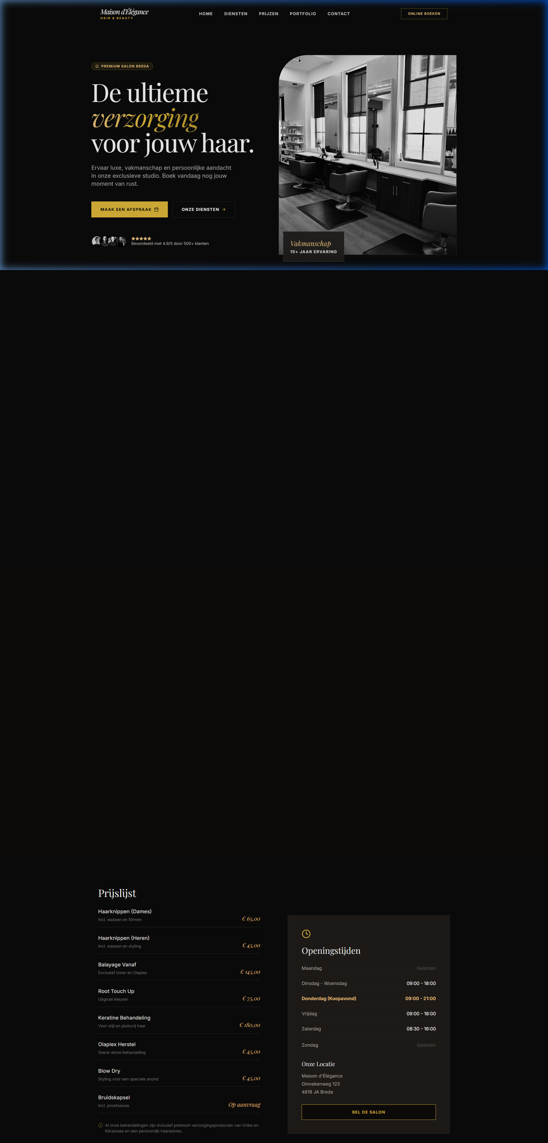 Stijlvolle kapperwebsite met online afsprakensysteem, diensten en een professional portfolio.