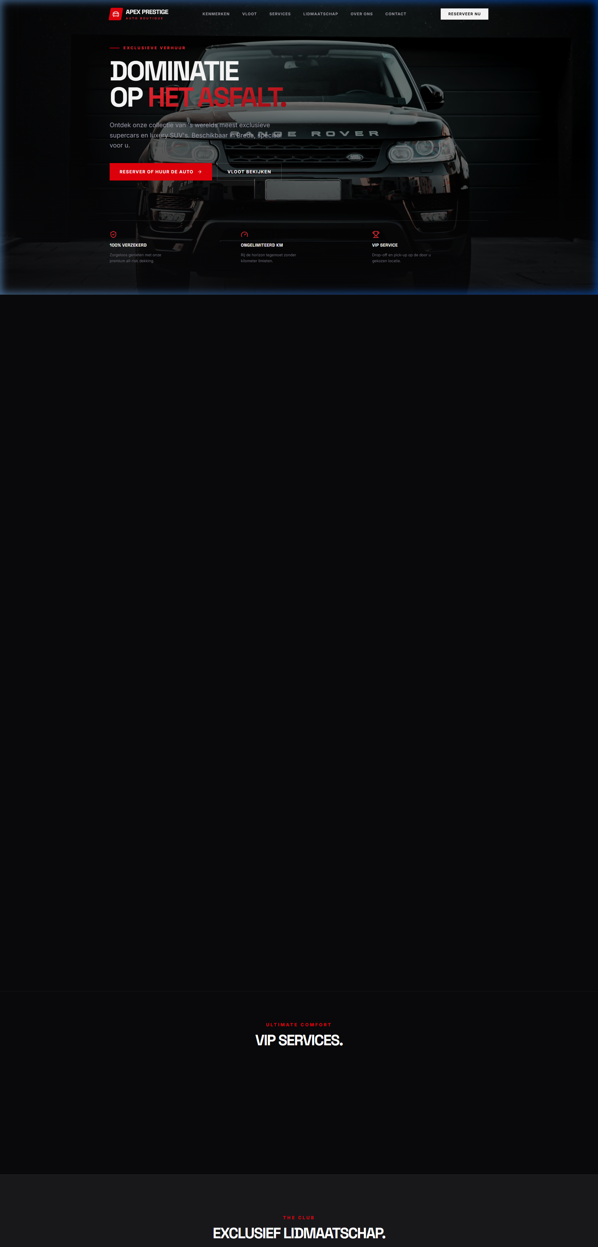 Exclusief autowebsite voor supercar-verhuur met online reserveringen, vlootoverzicht en VIP-lidmaatschap.